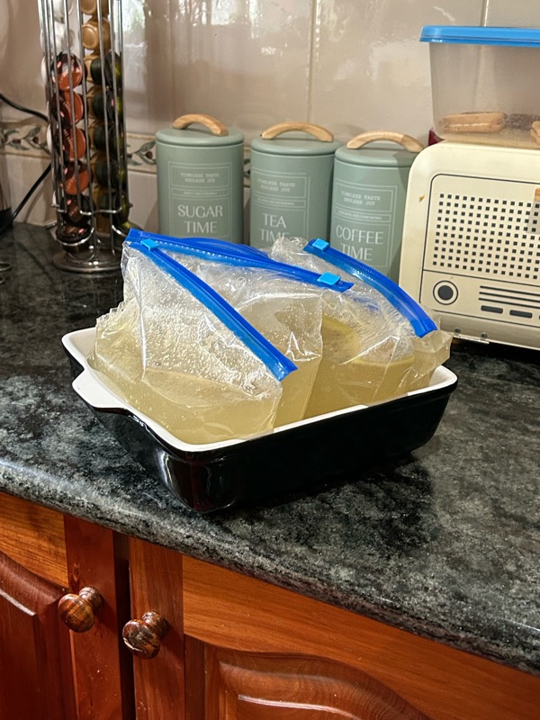 I’ve bagged it up and it’s now in the freezer I ended up with six of these bags. Once frozen I can take the baking dish out and just leave the bags in the freezer.