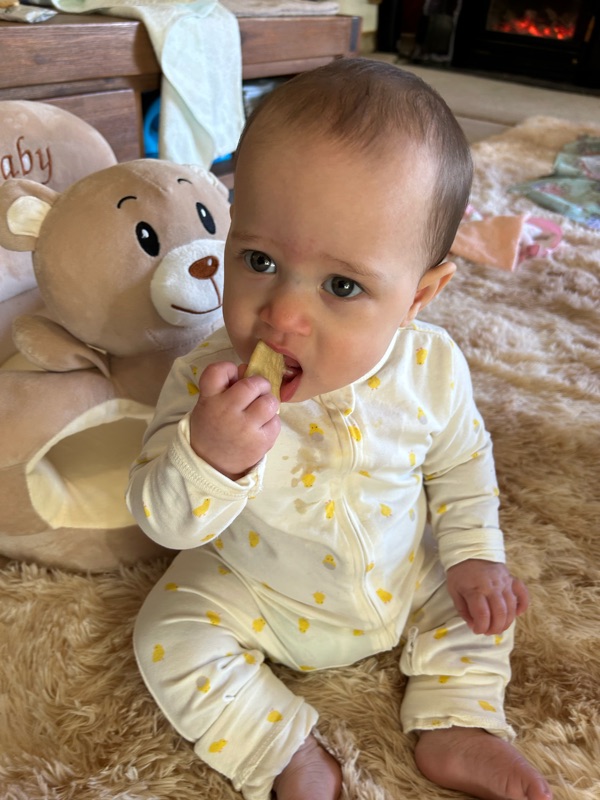 After lunch, stewed fruit, I gave her some baby rusks. These pretty much dissolve as soon as saliva hits it.