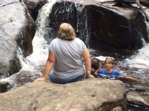 Here is the back of bronwyn and Kay and I in the water in the middle of the water fall. It was freezing. But as it's like fifty steps down to it. It was very nice once you got in.