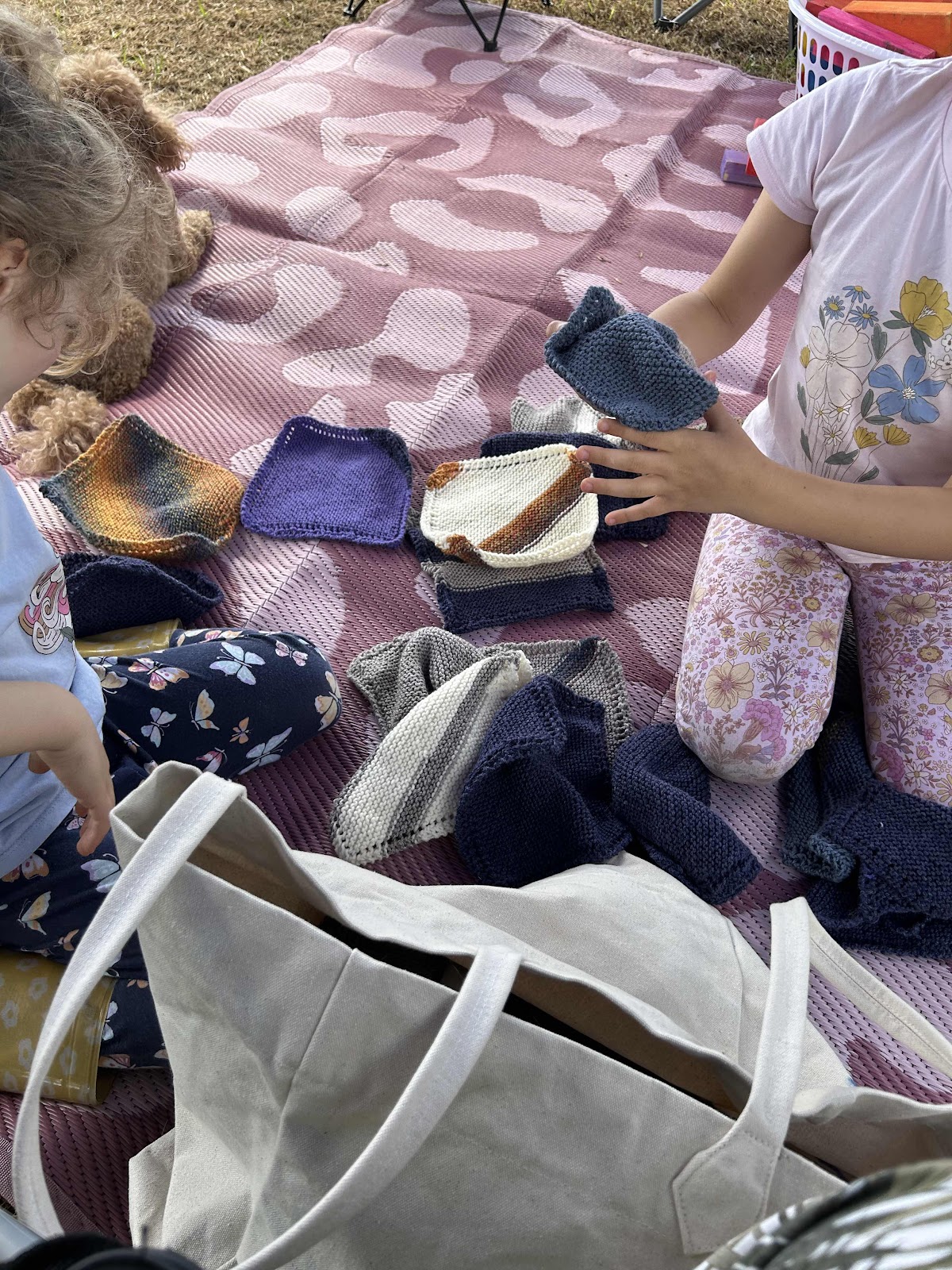 The girls were playing with my knitted squares and started to make a pattern out. Still have many many more to knit
