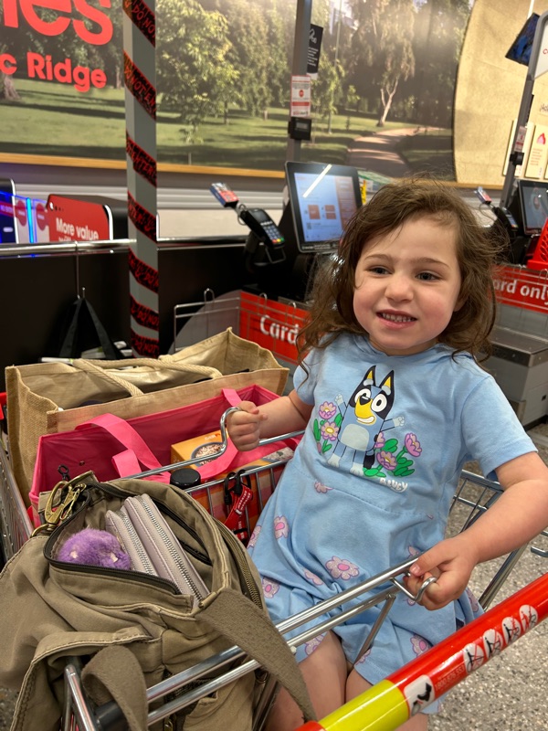 she’s such a good girl she is happy to sit in the trolley and chat while I push her around the isles