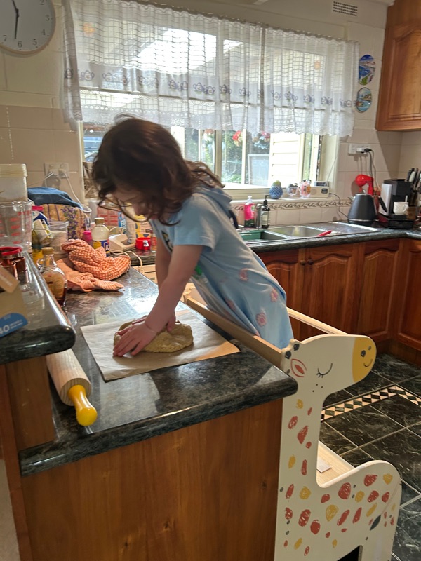 once mixed I asked her to flatten it out on brown paper while I found the rolling pin