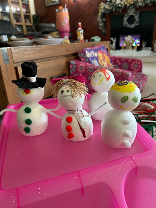 We made some snow people. We, well me, made a couple of small wreaths to hand on the tree. But I forgot to take pictures