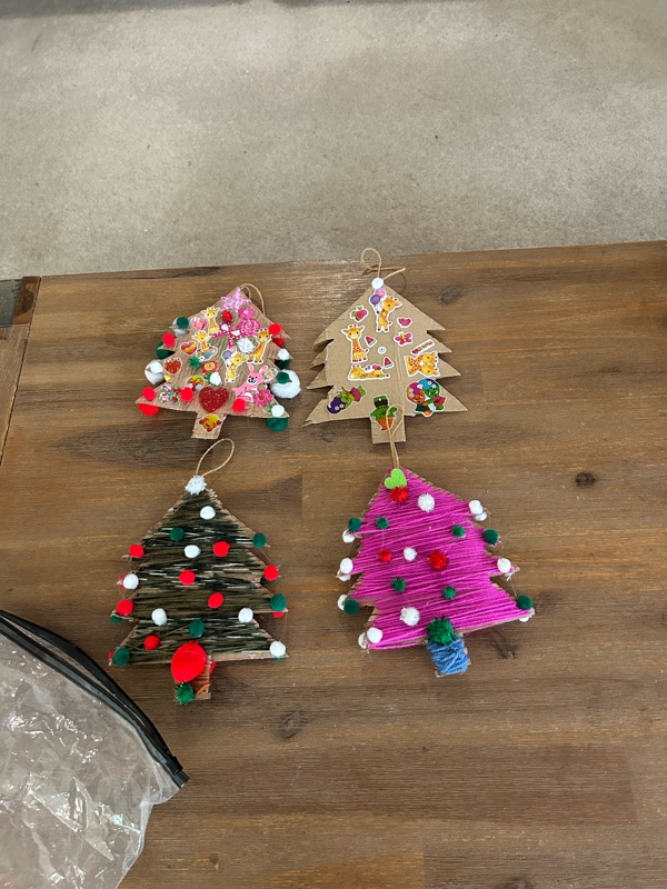 She did start to wind the yarn around one of the trees but quickly got bored with that so grandma finished the yarn bit and she decorated them grandma wax the only one allowed to use the glue gun, because it’s adult only