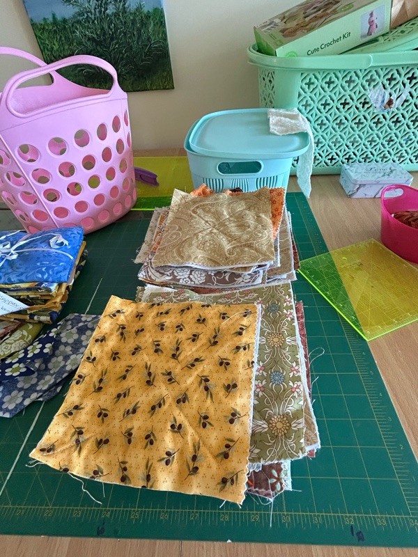 Squares I’ve quilted to make a quilt as you go blanket