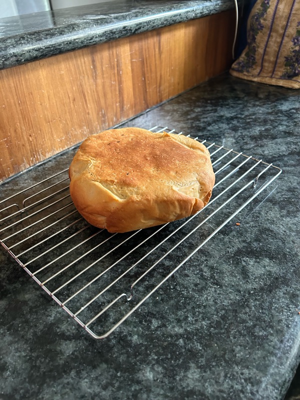 I forgot to slash the top and it’s a bit of a funny shape, because of the brown paper I had lined the Dutch oven with