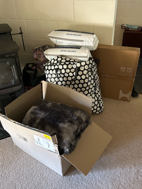 In the corner there’s a bag of excess plates and the black bag has another quilt and a crochet blanket