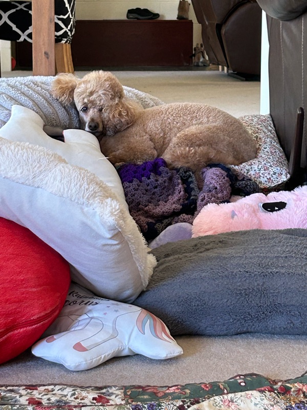 Trixie had her spa day today. She knows when the extension cord is set up her personal hairdresser is coming.