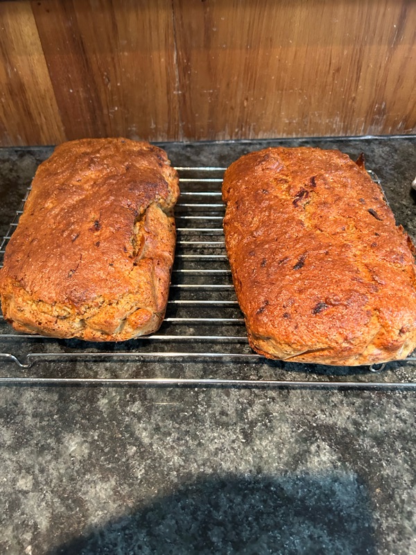 Banana bread, I had four very ripe bananas. I’m sure the boys at the shed will appreciate them