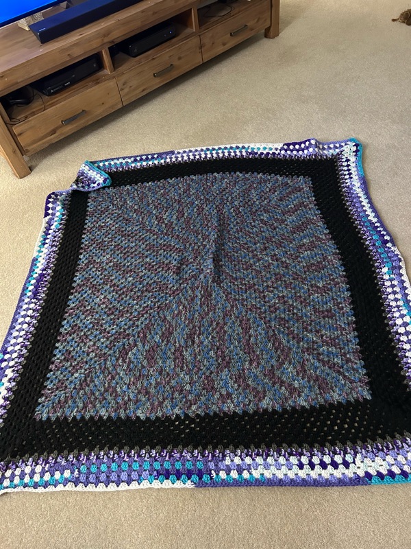 The ugly blanket is finished. I’m glad I made it bigger. It’s a perfect size for three little girls to snuggle under.