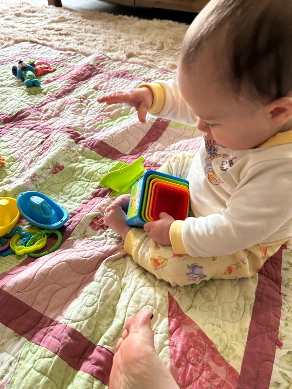 She loved pulling them all apart and banging them together. Grandma put some of those rings you can see in the largest box and rattled it